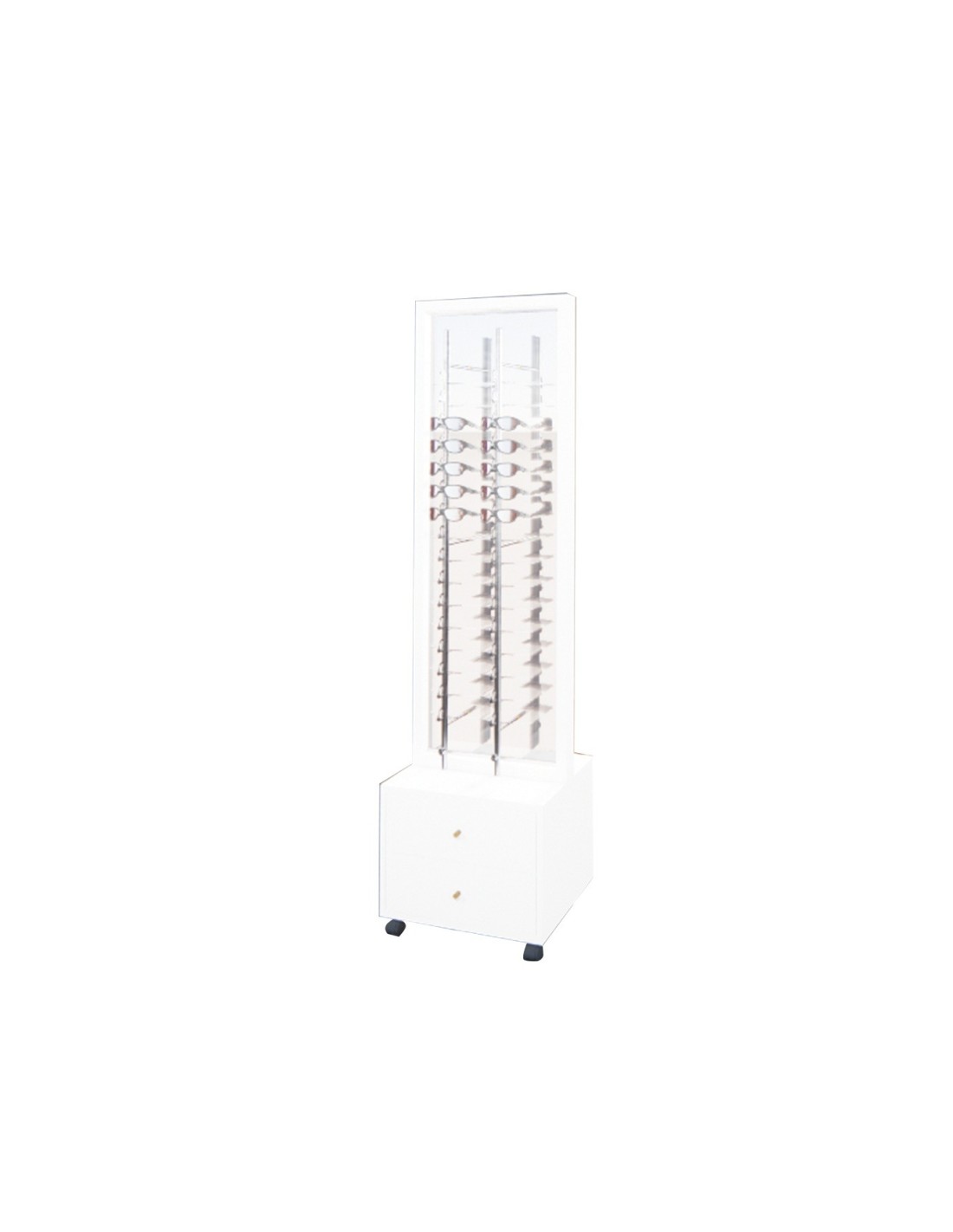 - Pour 64 montures : Présentoir de vitrine blanc avec 1 panneau en plexiglas tournant, 4 colonnes 16 positions et caisson bas. L 546 x H 1985 x P 400 mm