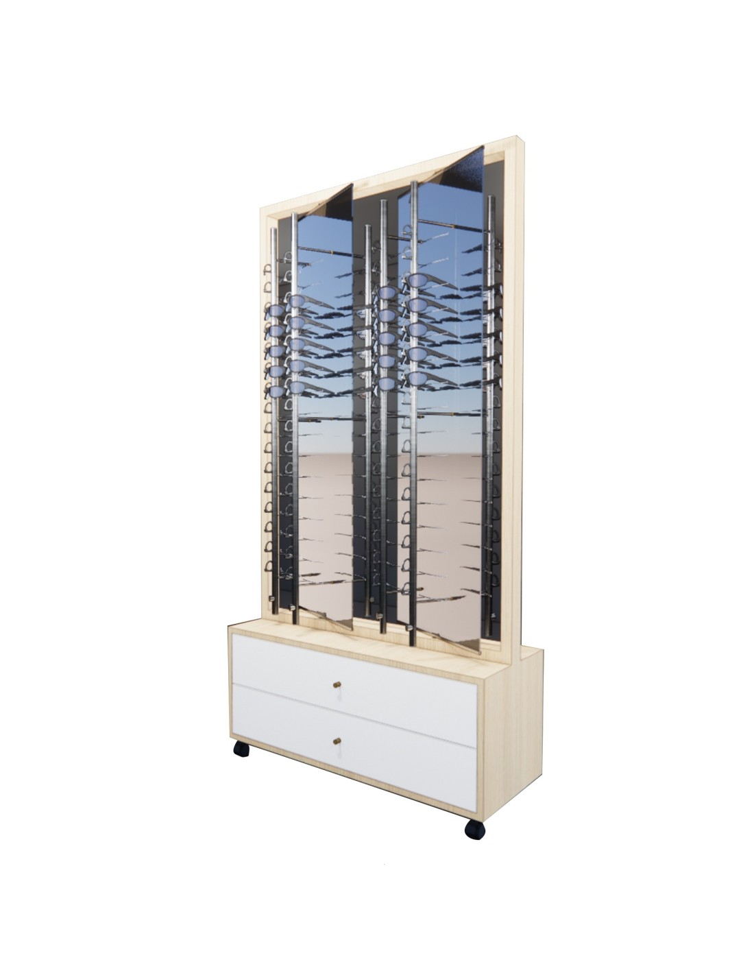 - Pour 128 montures : Présentoir de vitrine blanc avec 2 panneaux en plexiglas tournants, 8 colonnes 16 positions et caisson bas. L 1015 x H 1985 x P 400 mm.