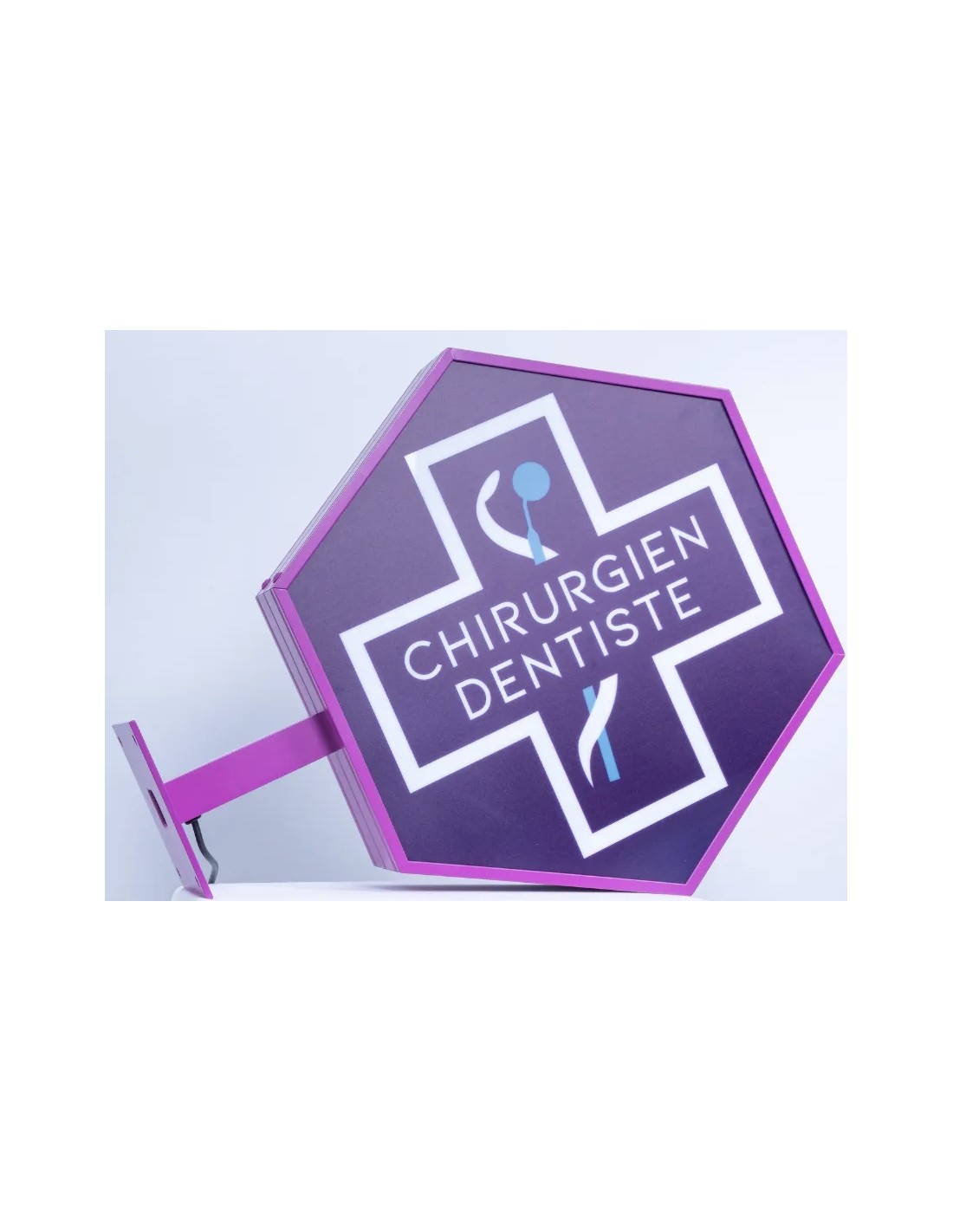 Choisir cette enseigne garantit une cohérence esthétique et professionnelle, évitant les dérives commerciales tout en rassurant le patient. Cette version non-lumineuse double face est spécialement conçue pour les chirurgiens-dentistes. Elle est conforme aux dimensions maximales autorisées par l’Ordre National des Chirurgiens-Dentistes (ONCD), intègre le logo officiel et peut recevoir un bandeau de spécialité.
