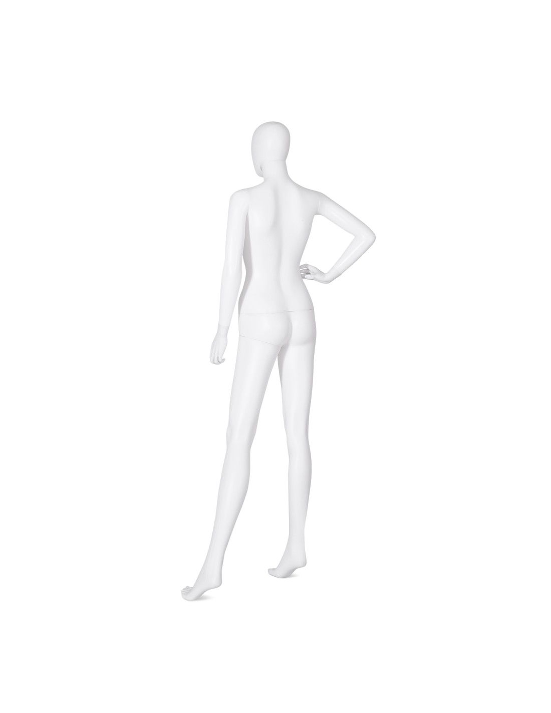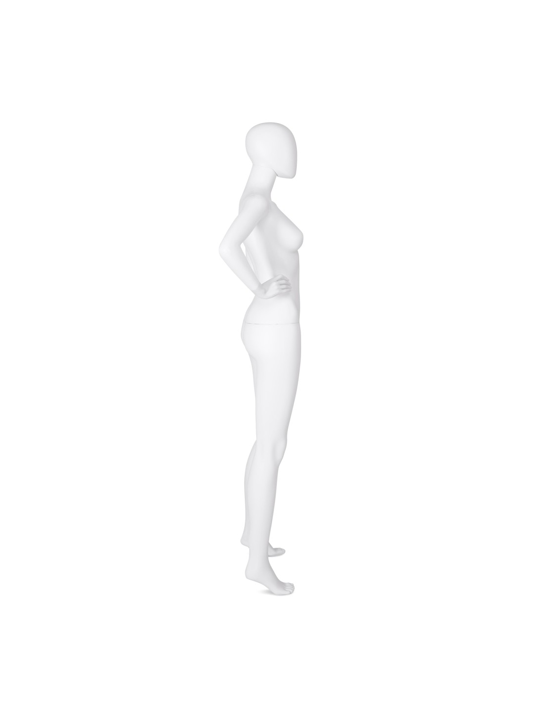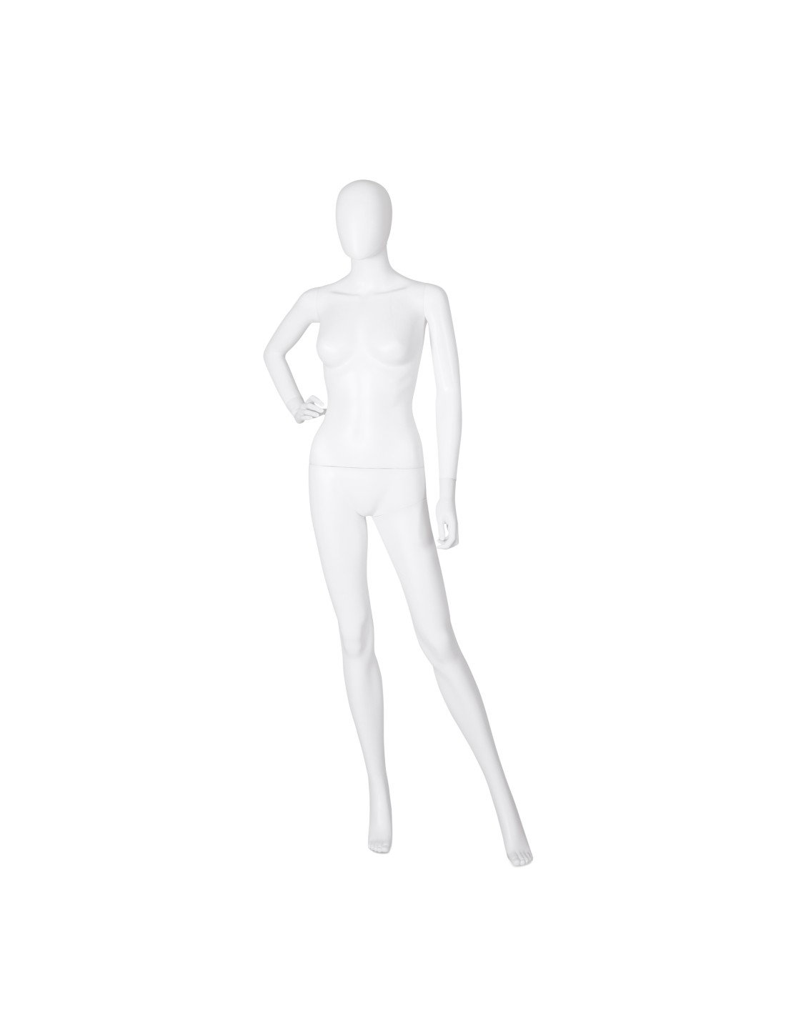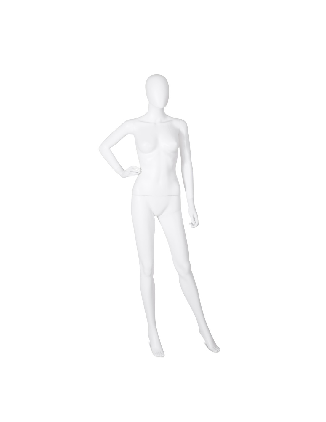 Mannequin femme abstrait, tête amovible, collection Unbreakable, matière plastique polypropylène antichoc, finition précoloré blanc. Tête interchangeable par un manchon plat. Livré avec sa une base rectangulaire en acier INOX brossé avec une tige au mollet.