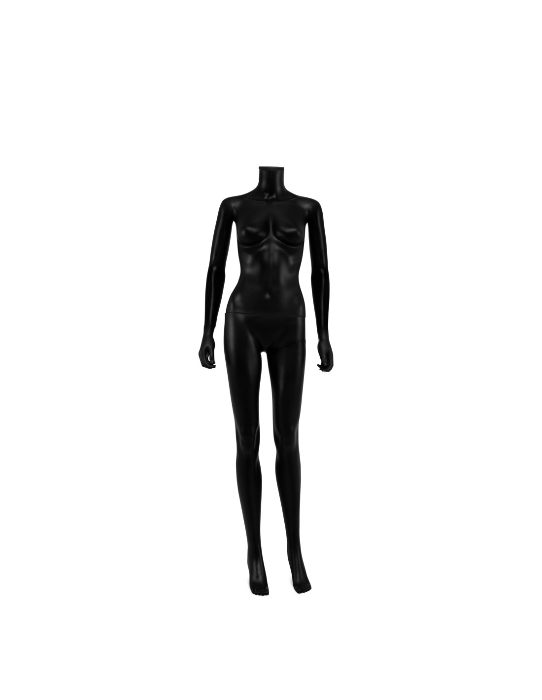 Mannequin femme abstrait, tête amovible, collection Unbreakable, matière polypropylène antichoc, finition précoloré noir. Tête remplaçable par un manchon plat. Livré avec une base en verre trempé carrée avec une tige au mollet
