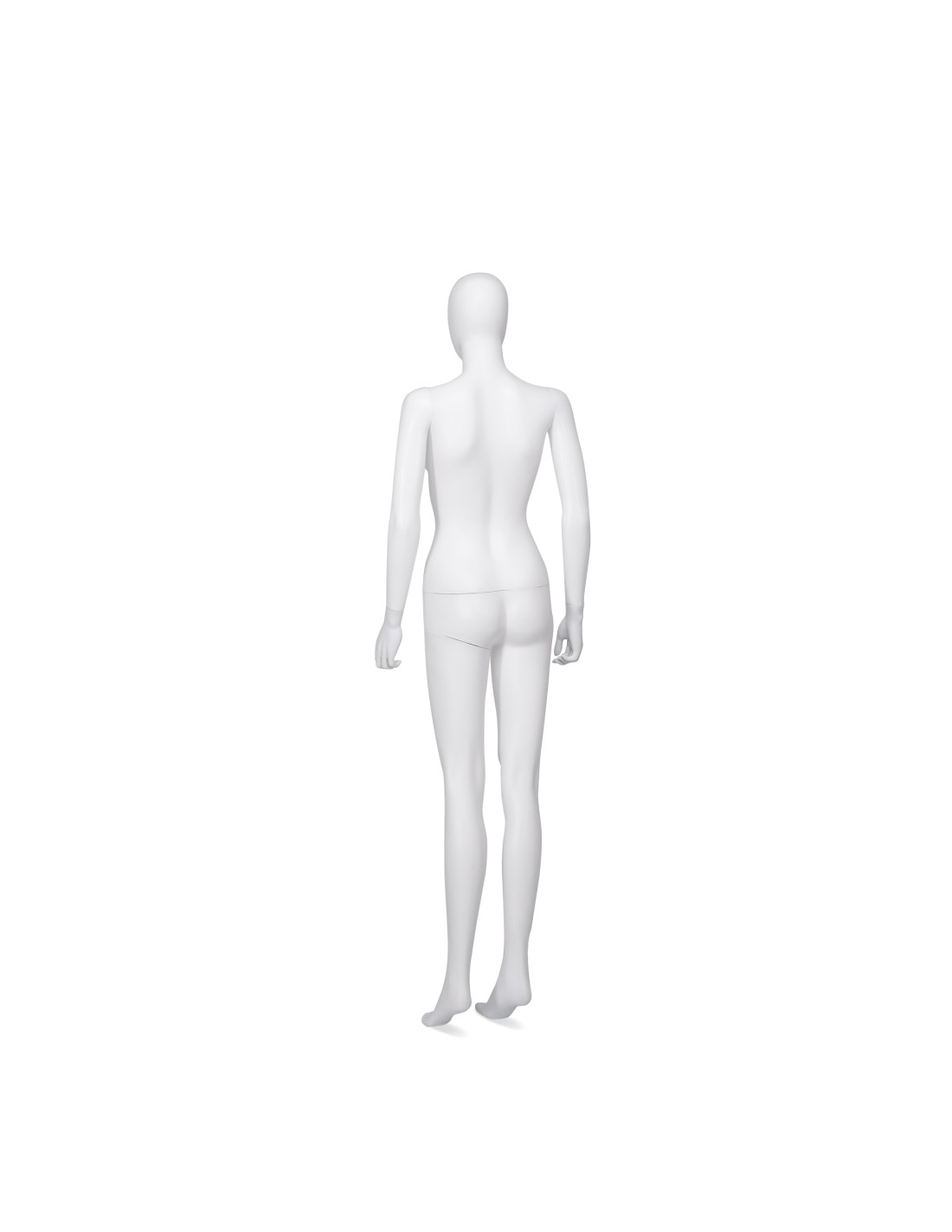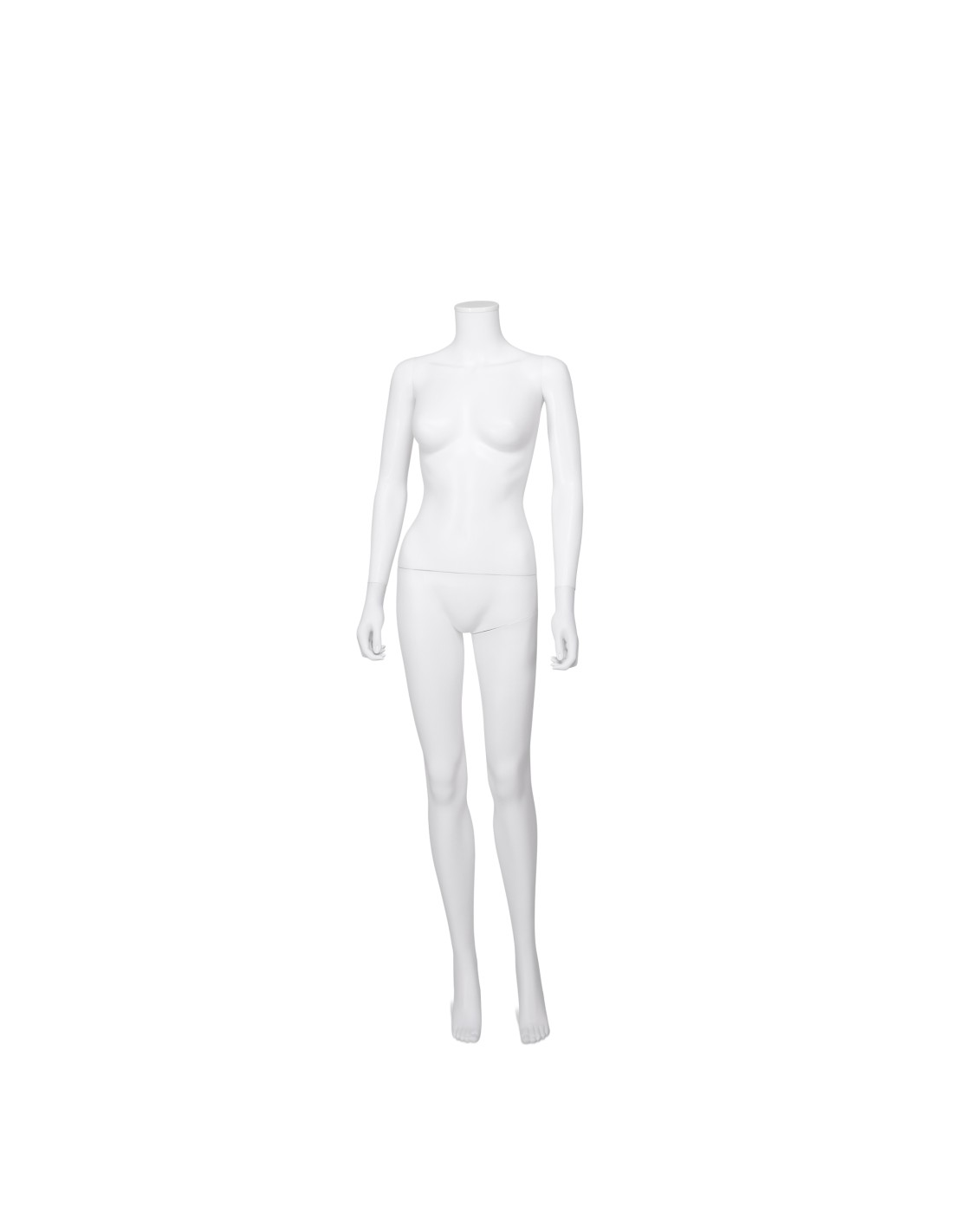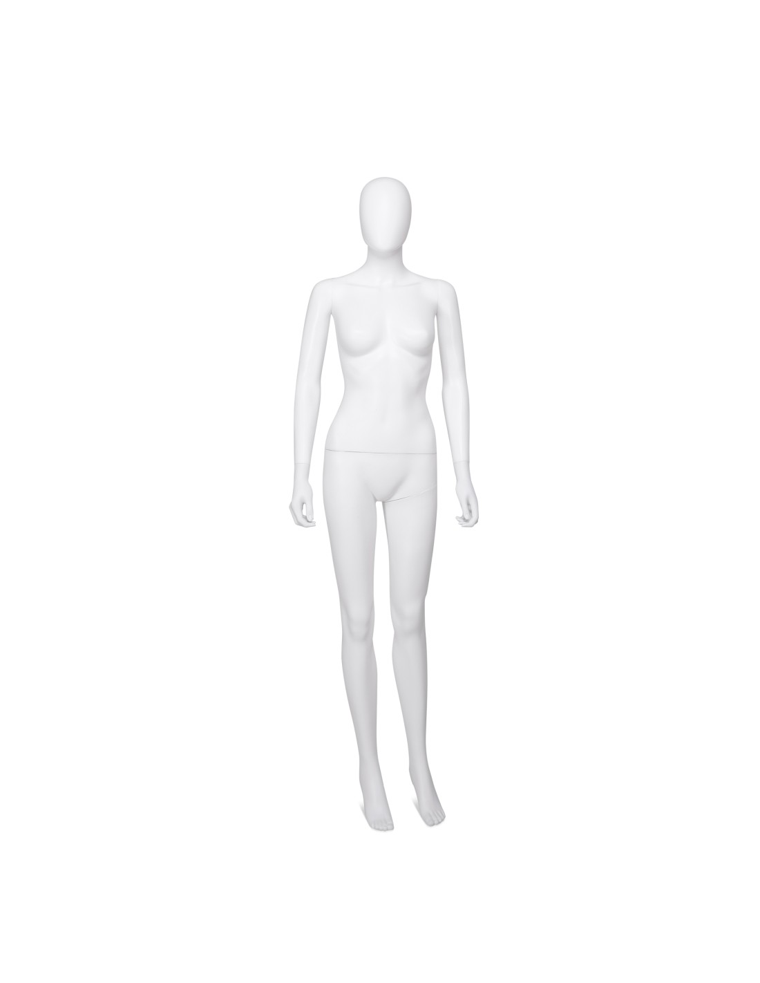 Mannequin femme abstrait, tête amovible, collection Unbreakable, matière polypropylène antichoc, finition précoloré blanc. Tête remplaçable par un manchon plat. Livré avec une base en verre trempé carrée avec une tige au mollet