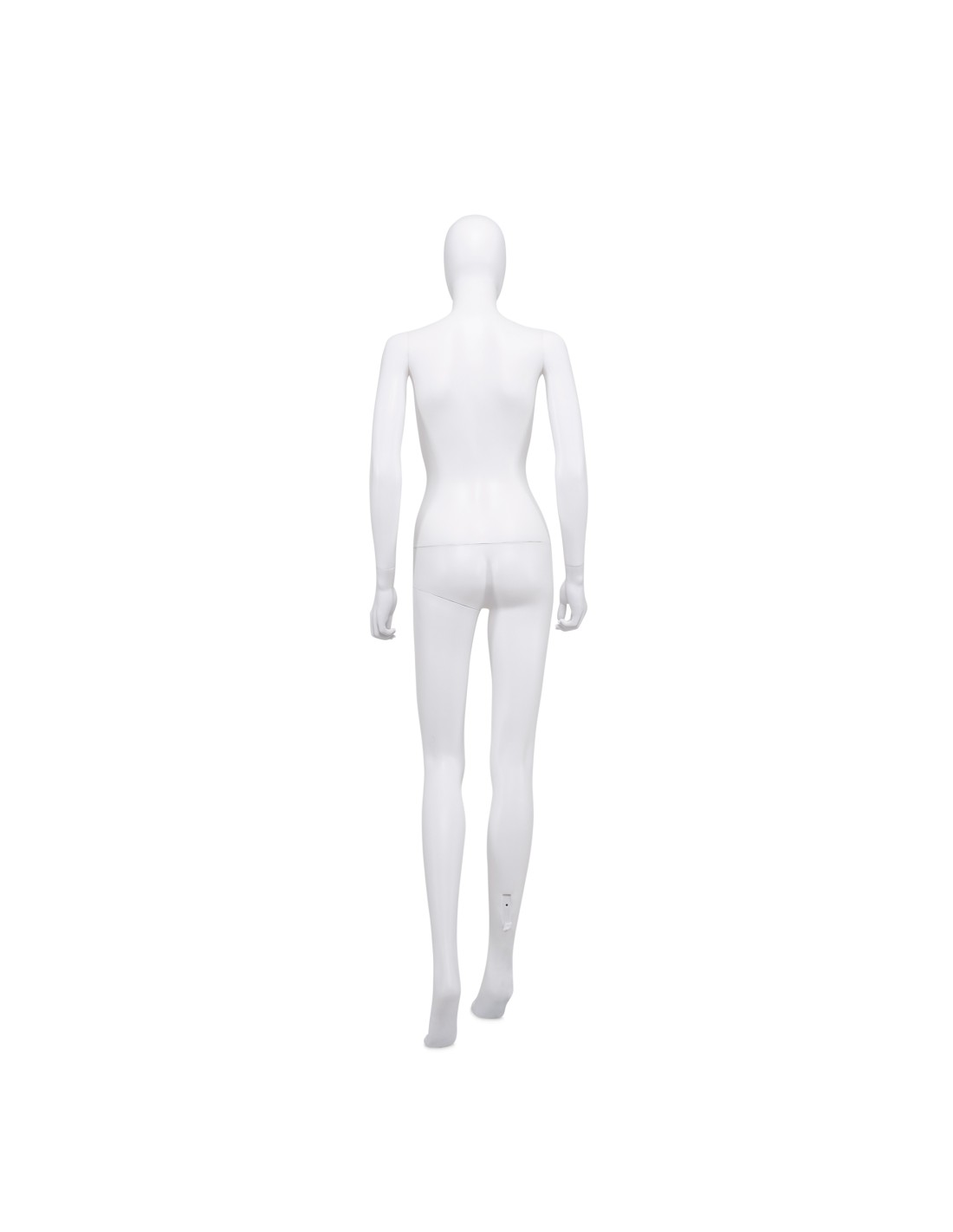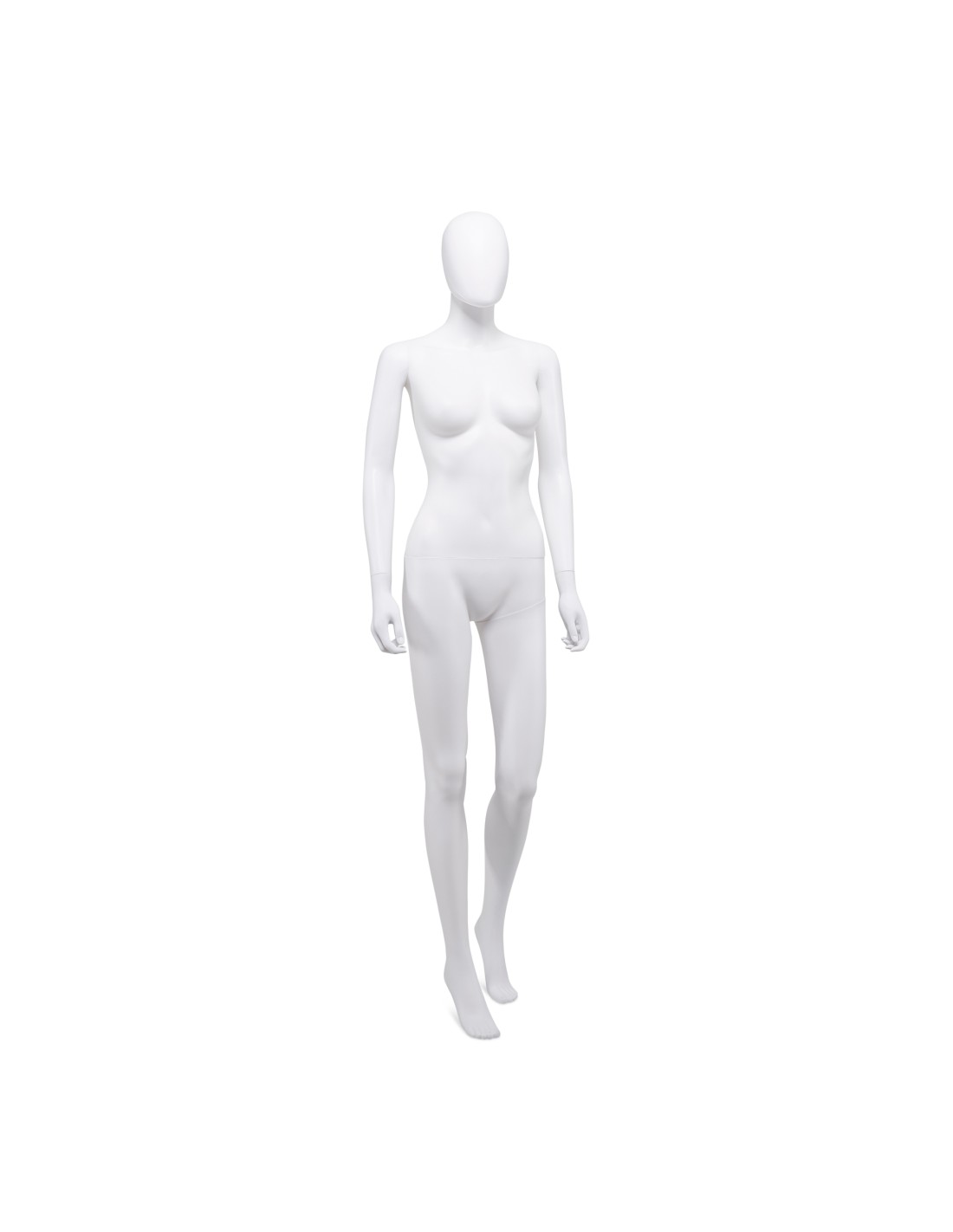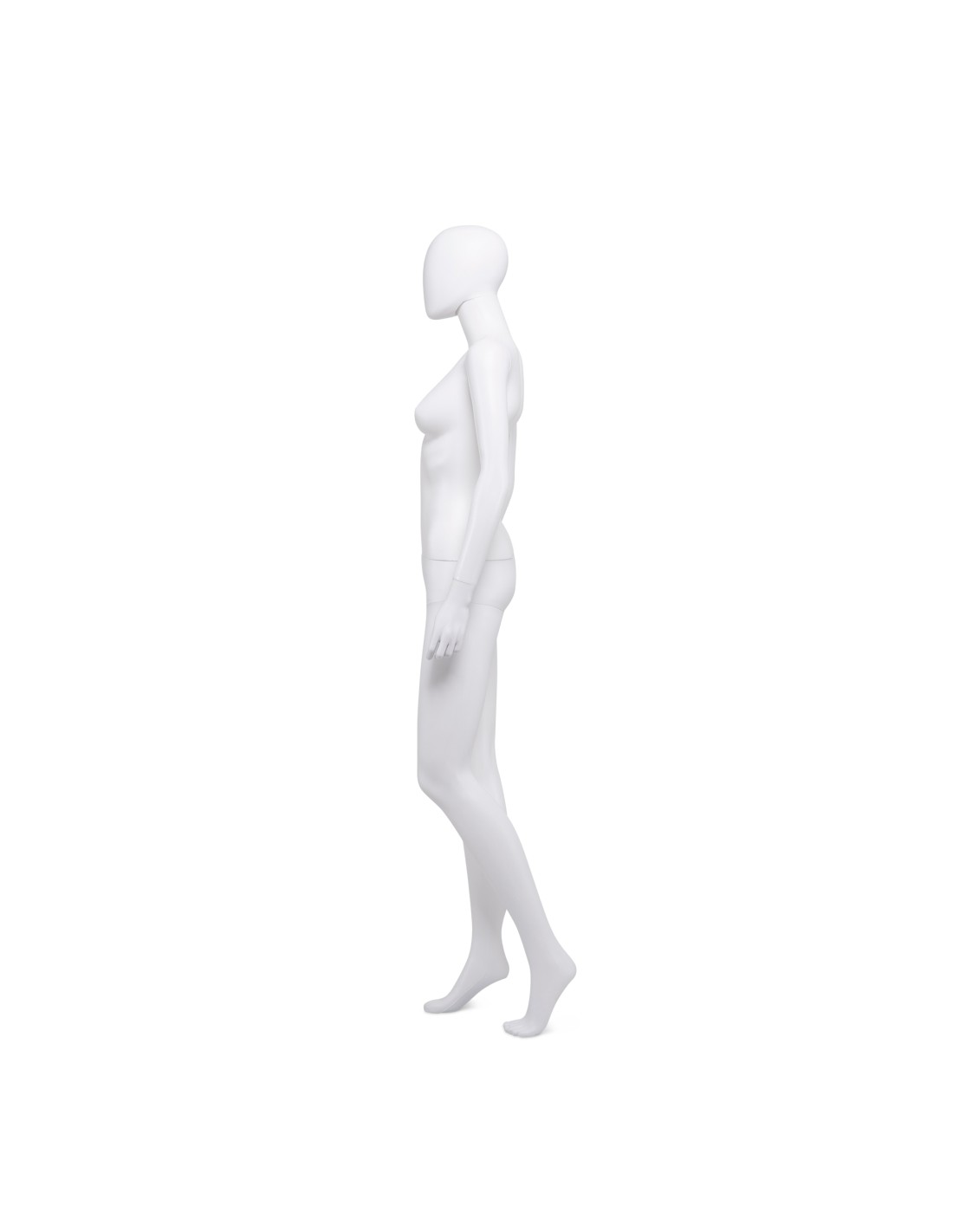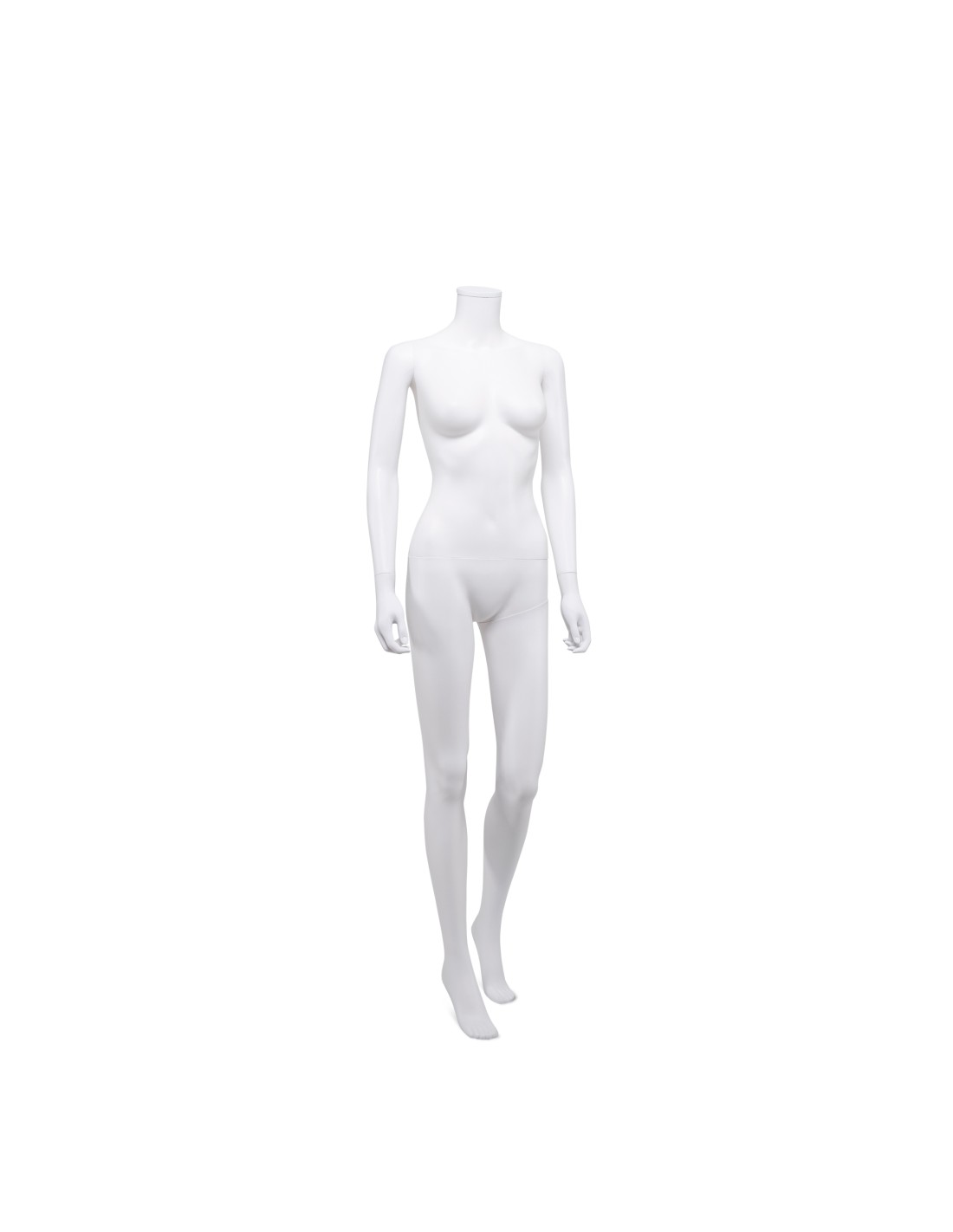 Mannequin femme abstrait, tête amovible, collection Unbreakable, matière plastique polypropylène antichoc, finition précoloré blanc. Tête interchangeable par un manchon plat. Livré avec une base rectangulaire en inox brossé avec une tige au mollet