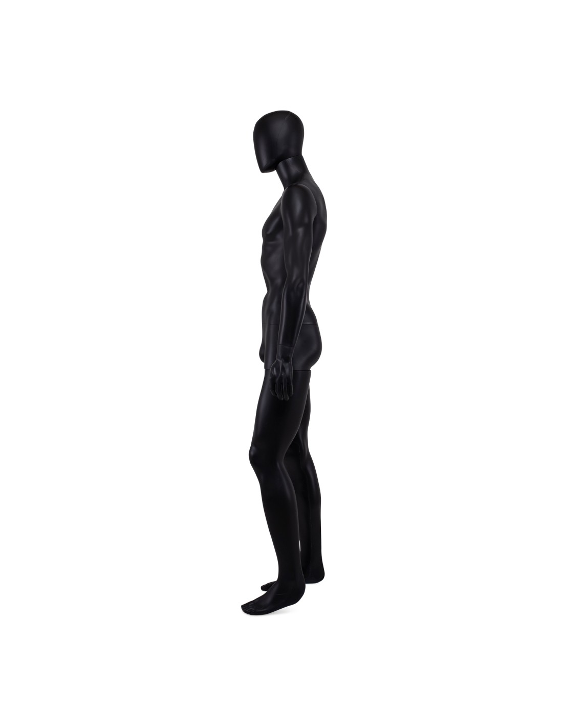 Mannequin homme abstrait, tête amovible, collection Unbreakable, matière polypropylène antichoc, finition précoloré noir. Tête interchangeable par un manchon plat. Livré avec une rectangulaire en acier inox brossé avec une tige au mollet