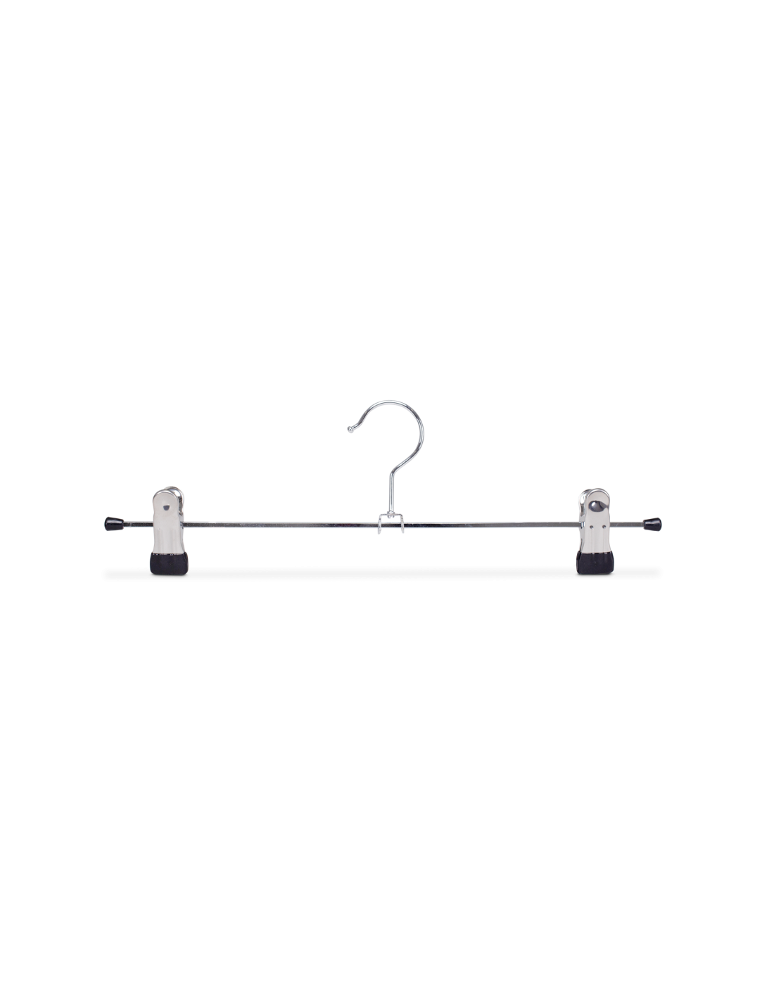 | Cintre à pinces de 35 cm en métal chromé, avec pinces réglables recouvertes de caoutchouc pour un effet antidérapant puissant. Idéal pour présenter des jupes, pantalons, etc. - boîte de 50 pièces |