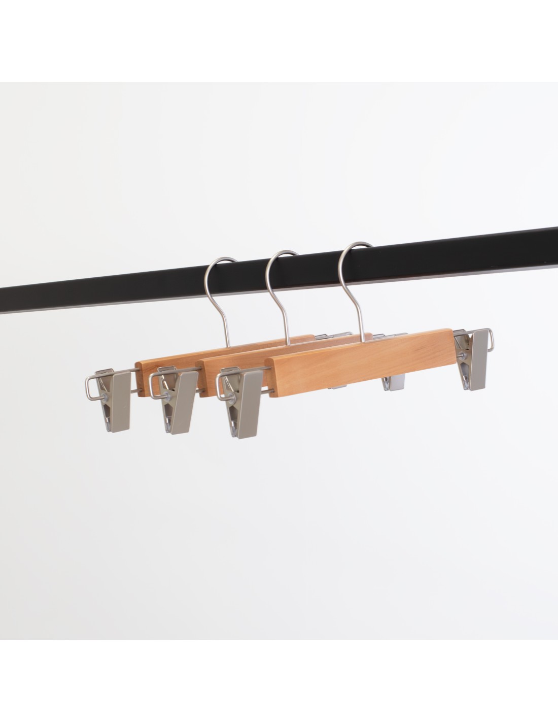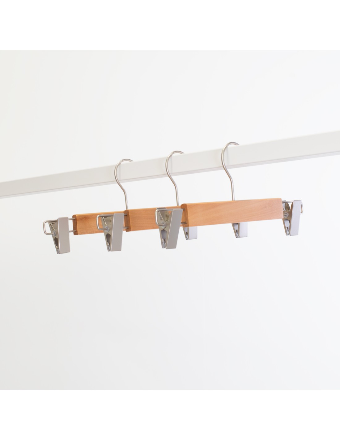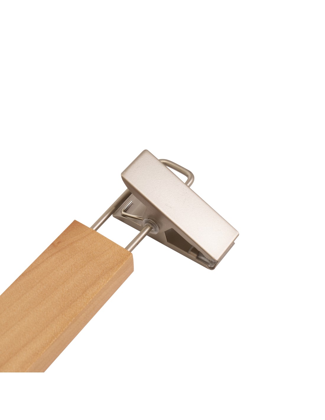 | Cintre en bois pour pantalons et jupes, avec pinces réglables en nickel, largeur 28 cm, bois de lotus, finition vernis transparent, crochet nickel mat - carton de 100 pcs. |