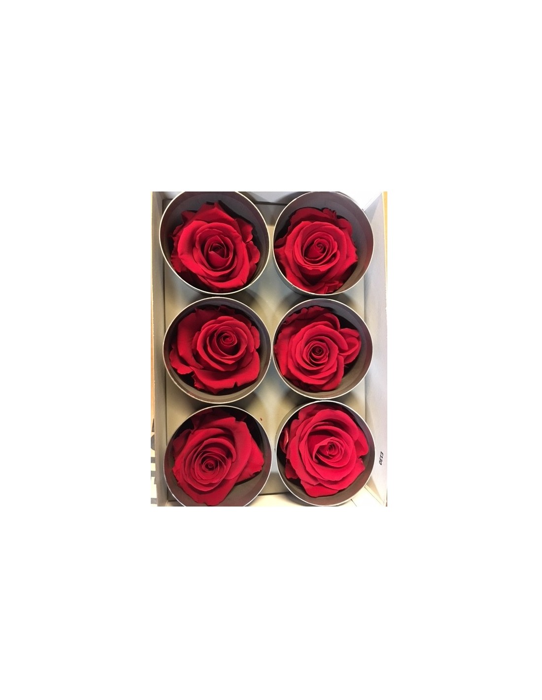 Boite de 6 roses stabilisées. Taille de la fleur : hauteur 5 cm plus tige 1 cm. Largeur 5/5.5 cm environ.