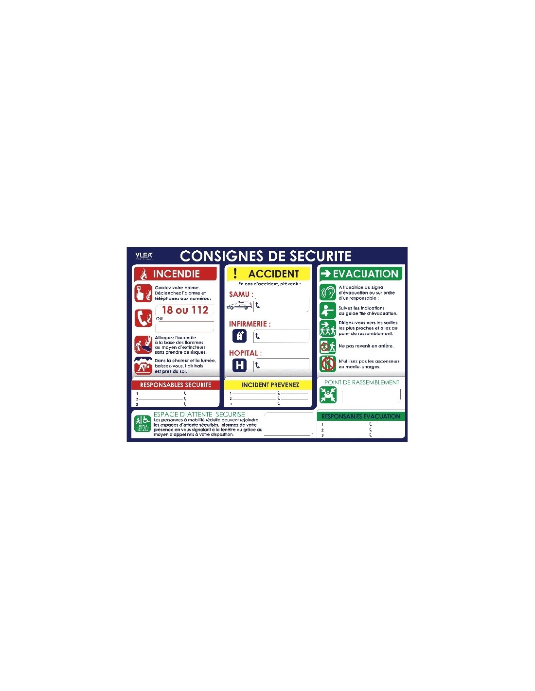 - 1 panneau de sécurité informant vos salariés et visiteurs des consignes à respecter en cas d'ACCIDENT / INCENDIE / EVACUATION. Dimensions 210 x 297mm et en PVC.