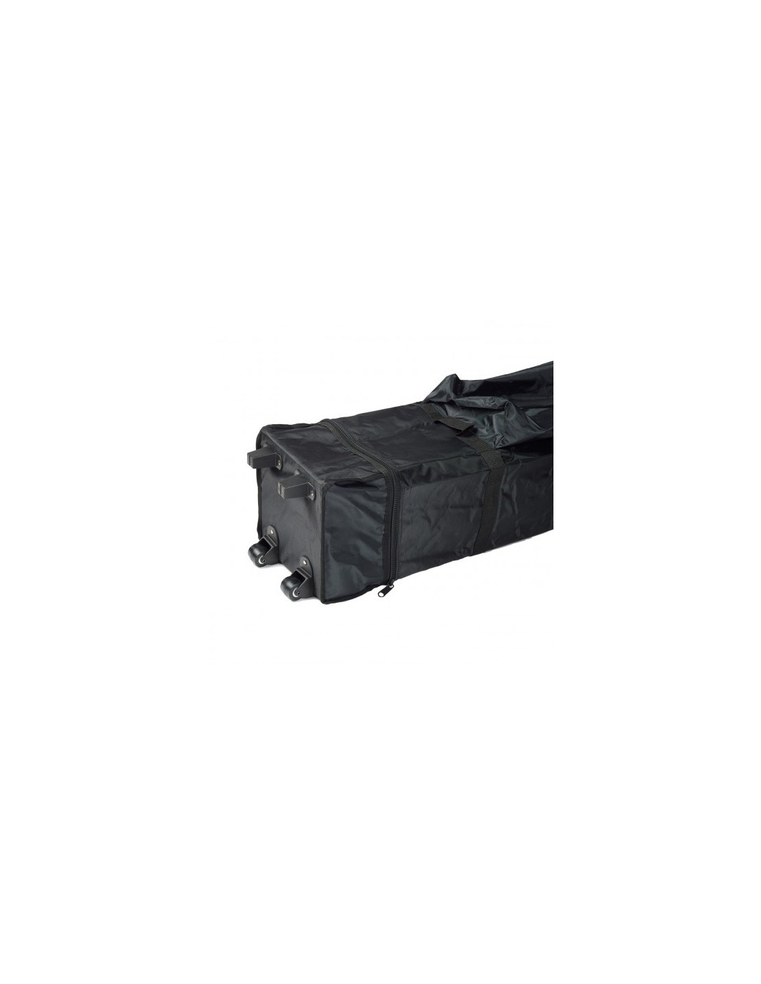Fabriqué en tissu plastifié et en PVC durci, il est équipé de sangles, de poignées, de deux roues et de deux petits pieds pour un transport aisé.