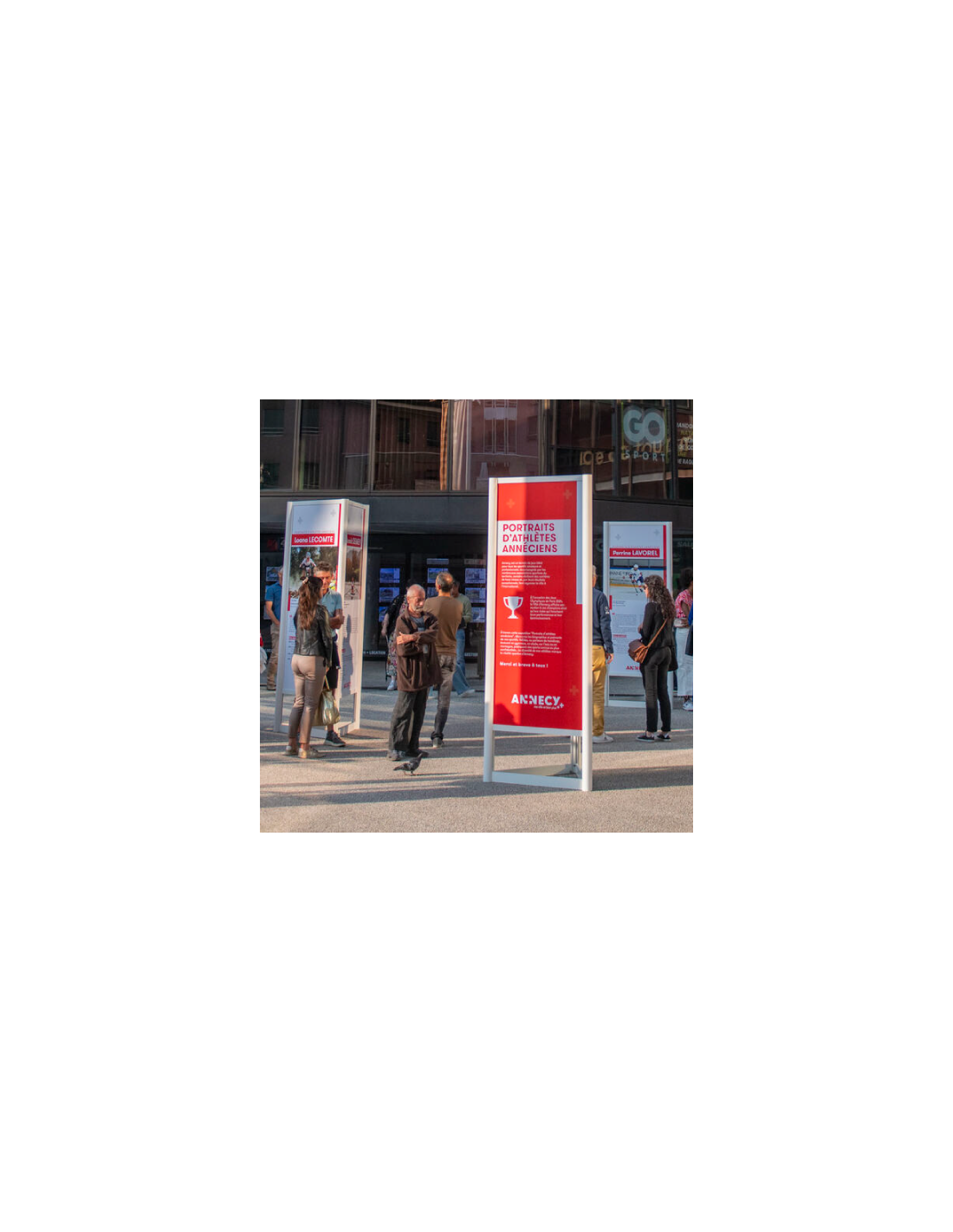 Totem triptyque pour intérieur et extérieur, sans fixation au sol.